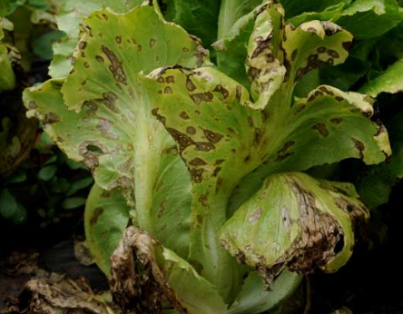 ◦ 병반은 약간의 겹무늬로 나타나고 중앙에 눈동자와 같은 회색 반점이 형성되며, 심하게 감염된 잎은 병반들이 서로 융합하여 커지고 잎이 누렇게 변하여 말라 죽음