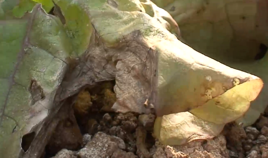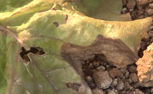 ◦ 처음에 바깥 잎의 가장자리 또는 잎살 부분에 수침상의 작은 반점이 나타나 점차 흑갈색으로 되어 부정원형 혹은 V자형 모양으로 확대되고 잎 전체에 퍼져 갈색으로 말라 죽음