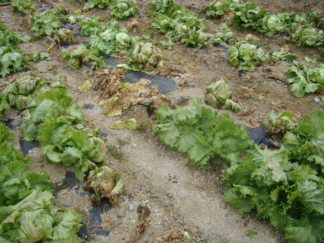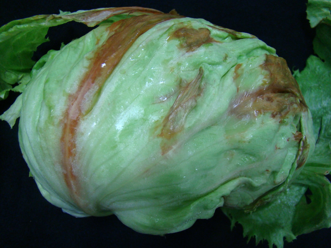 ◦ 결구상추 수확기인 저온기(19~21℃)에 오래된 외엽부터 주로 발생하고 중륵 주변에서 갈변 증상이 점차 커지며, 잎 가장자리 부근에도 피해를 나타냄