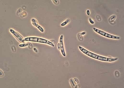 ◦ 불완전균에 속하며, 소형분생포자(단세포, 계란형 또는 콩팥모양, 크기 2.5~ 4×6~15㎛)와 대형분생포자(초승달모양, 3~5세포, 크기 3.5~5.5×21~35㎛) 형성, 후막포자는 구형, 오래된 균사에서 형성, 직경 7~11㎛임