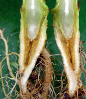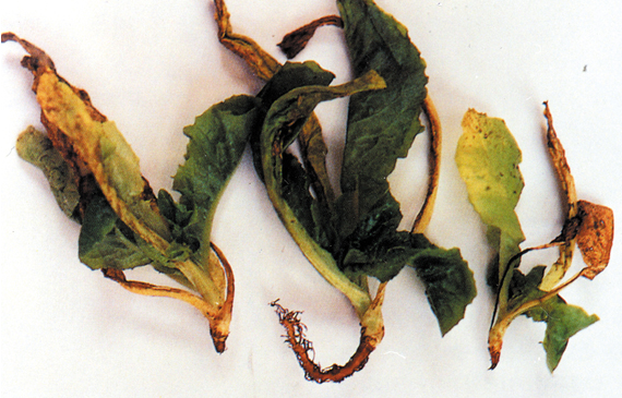 ◦ 아랫잎부터 활력이 떨어지고 황화되고 서서히 시들며, 병든 포기는 위축되기도 하는데 기온이 따뜻하고 건조하면 그루 전체가 말라 죽음