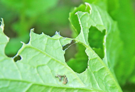 ◦ 성충이 20~20개씩 알을 무더기로 산란하므로 부화한 어린 유충은 표피에서 집단으로 엽육을 갉아먹지만 4~5령이 되면 잎 전체에 큰 구멍을 뚫으면서 가해함