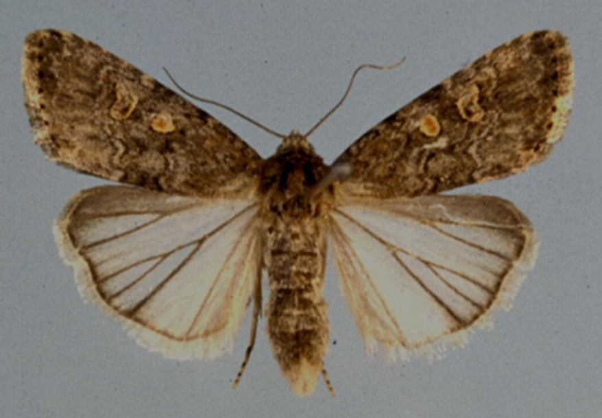 ◦ 성충은 15~20mm, 날개 편길이는 25~30mm 내외로 앞날개는 지저분한 회갈색이고 날개 중앙에 황색 점이 있으며 옆에 콩팥무늬가 있고 뒷날개는 희고 반투명함