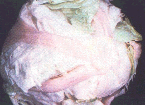 ◦ 성숙기가 지난 결구 상추에서 가장 많이 발생하는 증상으로 외엽의 증륵 조직이 분홍색으로 변색되고 심한 경우 잎을 제외하고 모든 잎의 줄기에 붉은색 이상 증상이 진전되기도 함