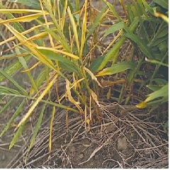 ◦ 4월 하순 재식 후 발아하여 3~4잎 정도가 지상부로 출현할 때인 6월 하순 ~7월 상순경부터 발생하는데, 지하부의 줄기, 근경이 병워균에 의해 수침상으로 썩기 때문에 썩는 부분에 해당하는 지상부의 잎이 노할게 황화되기 시작함