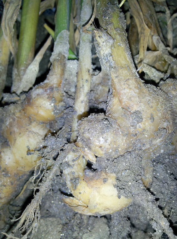 ◦ 병에 걸린 주를 뽑아보면 줄기의 지제부 부근이 수침상으로 썩어 잘 탈락하며, 근경도 옅은 회색으로 병이 진전하면서 그 표면에 흰색의 균사가 나와 있고 더 진전하면 근경의 내부가 완전히 썩어서 속이 빈채로 미이라화 됨