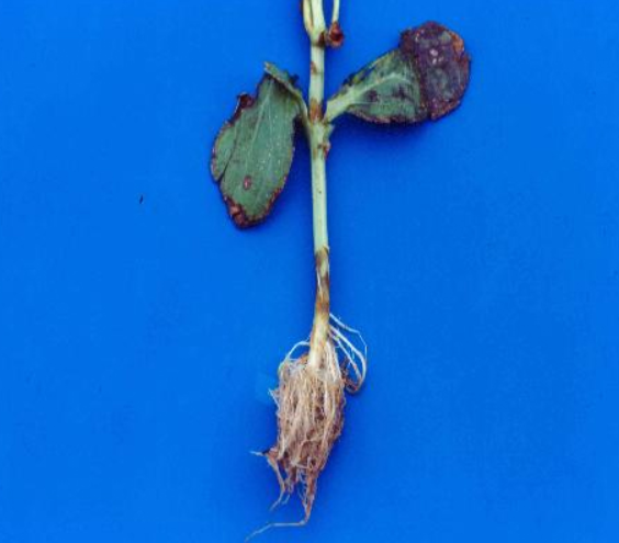 ◦ 잎자루, 줄기, 과경에서는 약간 움푹 들어간 암갈색 타원형 병반으로 나타나고 후에 담황색의 분생포자 덩어리가 형성되되며, 심하게 감염된 그루는 전체적으로 시들고 말라 죽음