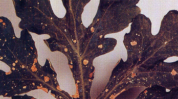 ◦ 병반에는 회색 내지 암회색의 분생포자가 많이 형성되며, 병든 잎은 퇴색하여 찢어지거나 구멍이 뚫리고 후에 말라 죽음