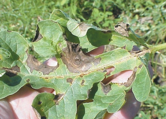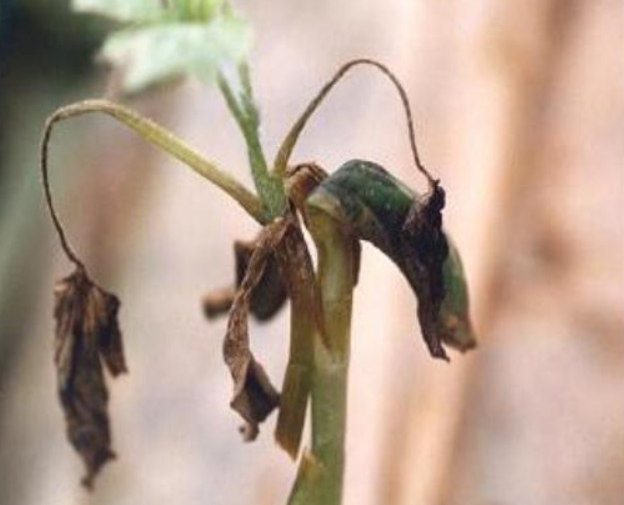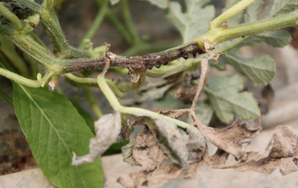 ◦ 줄기에는 처음 회갈색의 불규칙한 병반이 형성되고 심하게 진전되면 감염부위 위쪽의 식물체가 시들고 말라 죽음