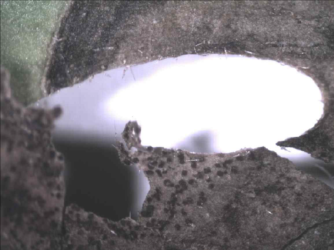 ◦ 잎에서는 처음 황갈색의 작은 반점으로 나타나고 진전되면 큰 원형 내지 부정형 병반으로 확대되며, 병반상에는 흑색의 소립점(자낭각)이 형성됨
