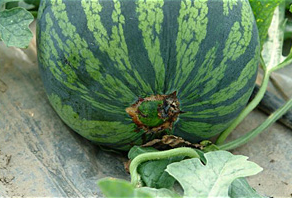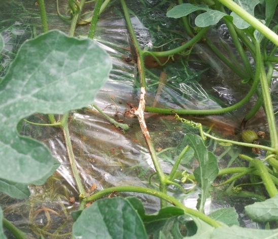 ◦ 줄기에서는 지제부 혹은 접목한 부위에서부터 회백색으로 변하여 썩으며, 흰 균사가 자라게 되고 감염부위에서는 후에 부정형의 검은 균핵이 형성됨