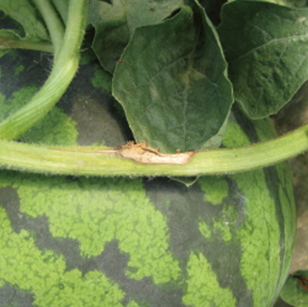 ◦ 과실에서는 주로 꽃이 달렸던 끝부분에서부터 감염이 시작되어 진전되면 과실이 물러 썩으며, 병든 부위에서 흰 균사가 자라면서 후에 줄기에서와 같은 균핵이 형성됨