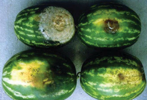 ◦ 병든 포기의 땅가 줄기와 굵은 뿌리는 수침상으로 썩으며 쉽게 뽑히고 과실에는 부정형의 큰 수침상 병반이 나타나며, 병든 부위에 하얀 균사체와 유주자낭이 형성되기도 함