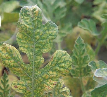 ◦ 피해 부위에는 백색의 작은 반점이 남으며, 초기에는 연녹색으로 변색되나 점차 피해가 심해지면 황색~갈색으로 변하여 낙엽이 됨