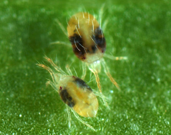 ◦ 암컷 성충은 0.5mm, 수컷은 0.4mm 정도로 여름형 암컷의 경우 담황~황록색으로 좌우 한 쌍의 검은 무늬가 뚜렷하고 다리가 거의 흰색에 가까움