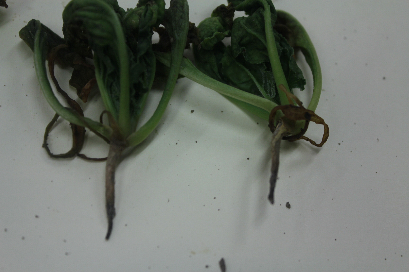 ◦ 생육 초기에 뿌리가 썩는 증상으로 지상부는 서서히 황화되다가 말라 죽는데, 자엽 발생기때부터 본엽 2~3매까지 하엽이 시들고 갈변하면서 수침상으로 됨
