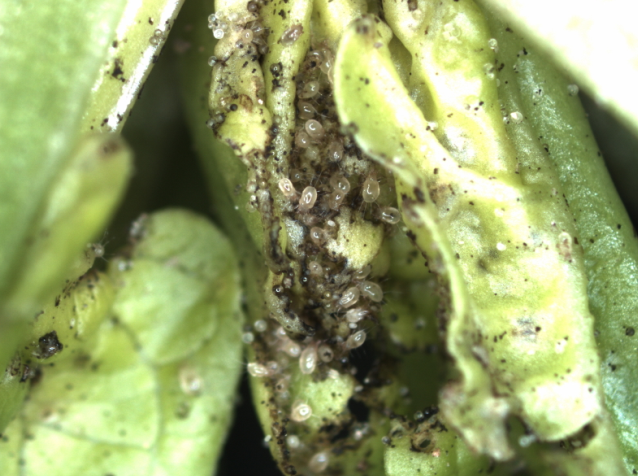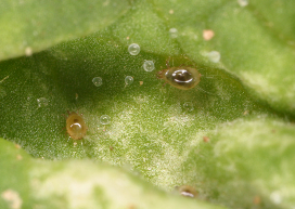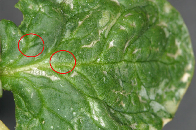 ◦ 신초 및 어린잎의 경우 흡즙에 의해 둥그렇게 작은 홈이 생기고 전개된 잎의 경우 홈의 가장자리가 돌기 모양으로 변형되고 갈변함