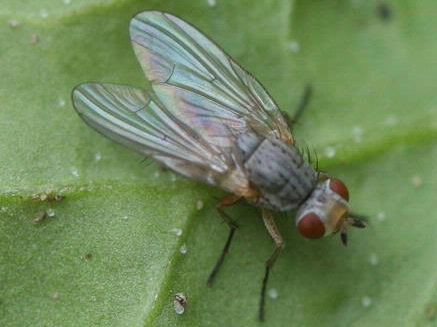 ◦ 성충의 몸길이는 5~6mm이고 날개편길이는 10mm 정도로 외형상 집파리와 비슷한 회색~회갈색 파리이며, 머리는 암적색, 이마는 은회색, 가슴은 회황색이며, 개체에 따라서 등쪽에 1~3개의 줄무늬가 있음