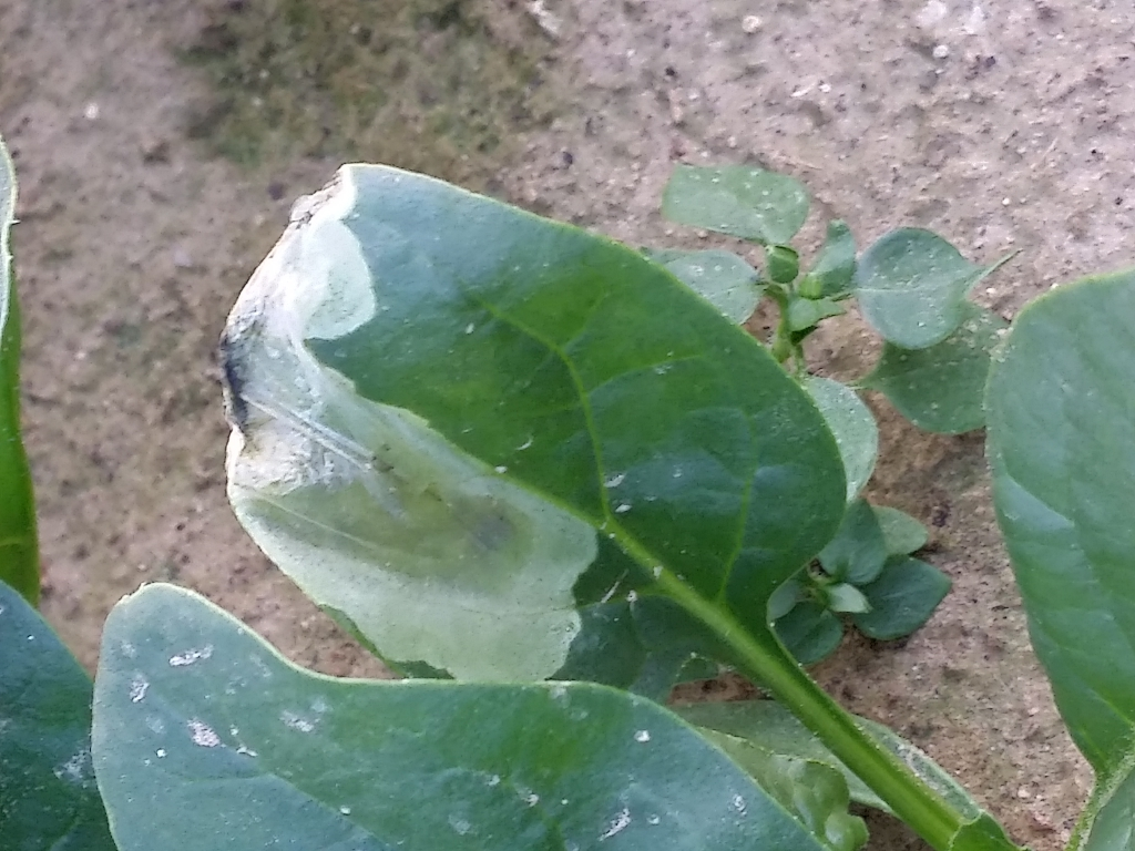 ◦ 유충이 시금치, 사탕무, 명아주, 소리쟁이 등의 엽속을 파먹고 다녀 잎의 앞과 뒷면 표피만 남기고 주머니 모양이 생기며 나중에 그 부위가 갈색으로 변함