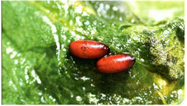 ◦ 성충은 6월, 7월, 8월, 9월 하순에 발생하고 알은 시금치 잎에 몇 개씩 무더기로 100개 이상을 산란함