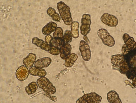 ◦ 분생포자는 타원형, 담갈색 내지 흑갈색, 횡격막과 종격막, 크기 25~40×20 ~30㎛임