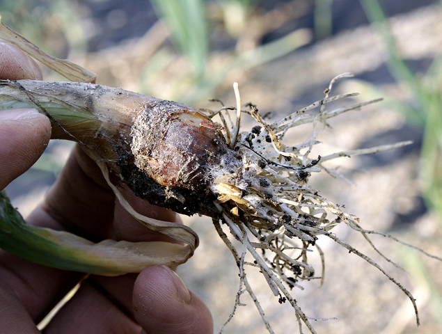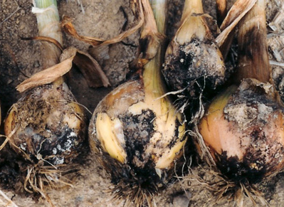◦ 처음에는 인경이나 뿌리에 회백색의 균사가 밀생하여 조직이 물러 썩고 진전되면 인경 전체에 흑색의 소립균핵이 형성되어 더뎅이 증상처럼 나타나며, 후에 인경과 뿌리가 모두 썩음