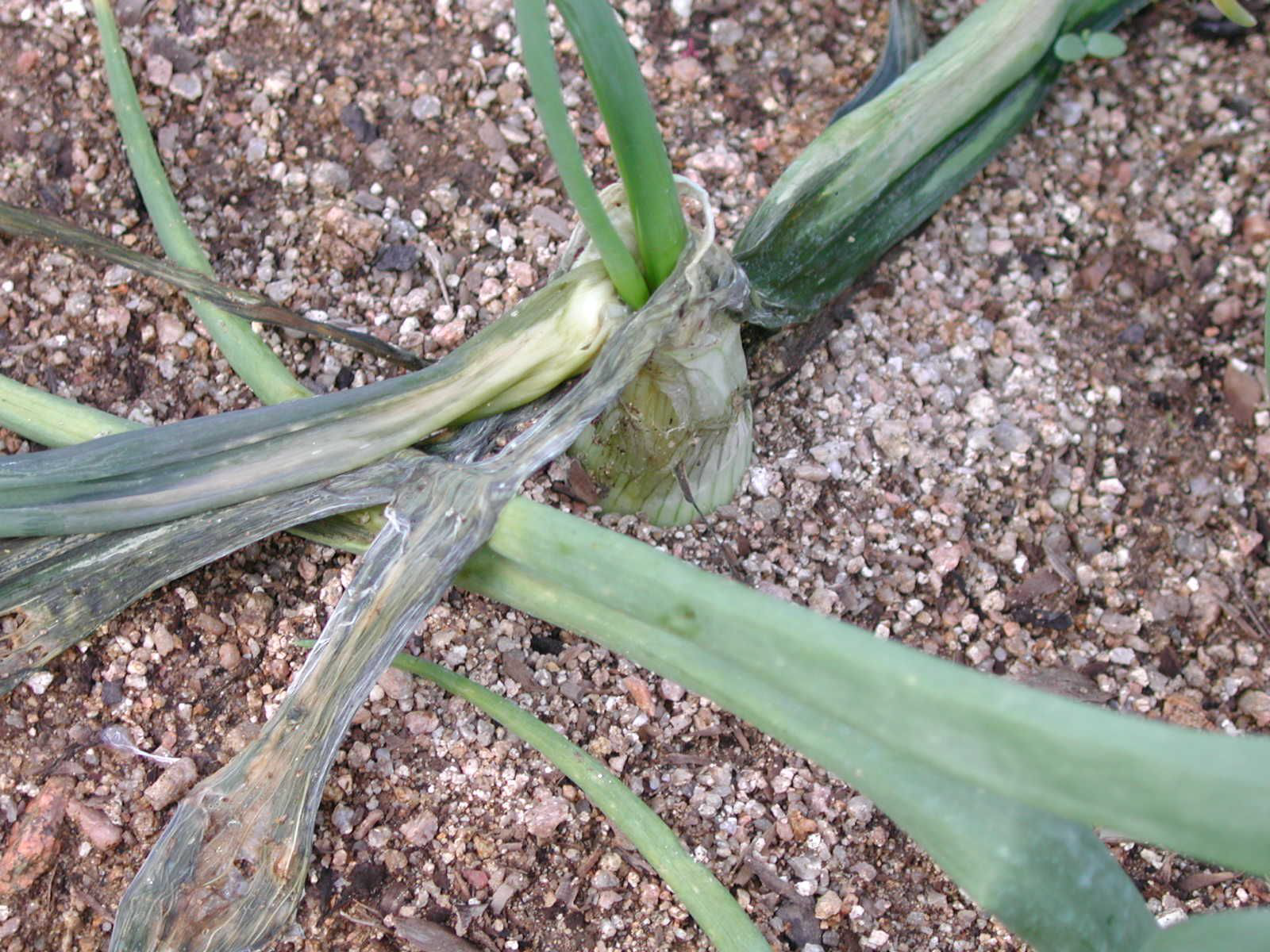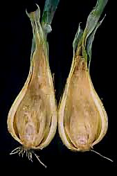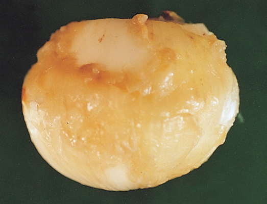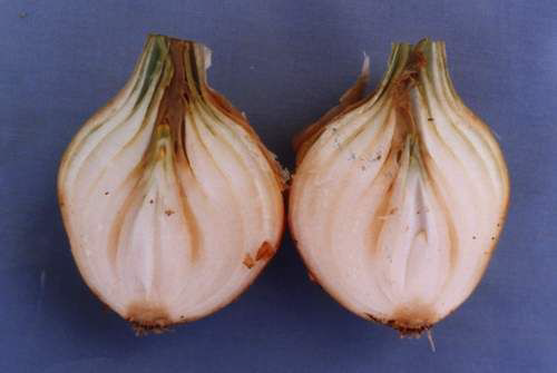 ◦ 구에서 발생하며, 황색 내지 담갈색의 수침상 병반이 나타나고 진전되면 구의 내부 조직이 물러 썩으며, 끈적끈적해지고 악취가 남