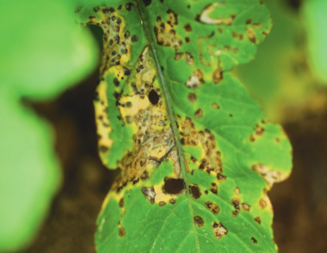 ◦ 오래된 병반의 내부는 찢어져 구멍이 생기기도 하며, 심하게 감염된 잎은 잎 전체가 황갈색으로 변하여 말라 죽음