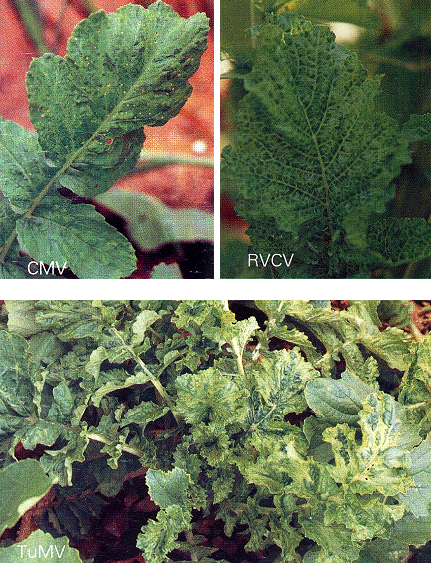 ◦ TuMV 및 RVCV는 유채, 무, 배추, 시금치, 쑥갓, 참깨 등에서 자연발병이 되므로 연속 재배를 하지 않고 진딧물을 철저히 방제하며, 이병주는 즉시 제거함