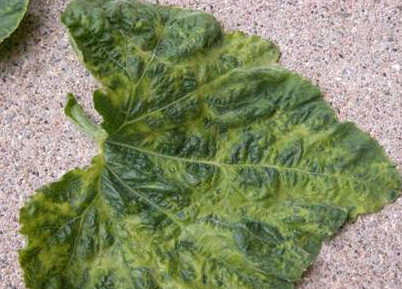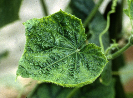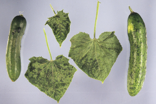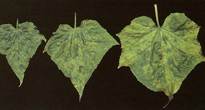 ◦ CMV에 의한 증상은 일반적으로 작은 황색 반점이 많이 보이는 모자이크로 나타나고 간혹 잎의 뒷면에 돌기가 생기는 경우가 있으며, 유묘에서부터 감염되었을 경우에는 과실이 얼룩무늬와 기형으로 나타남
