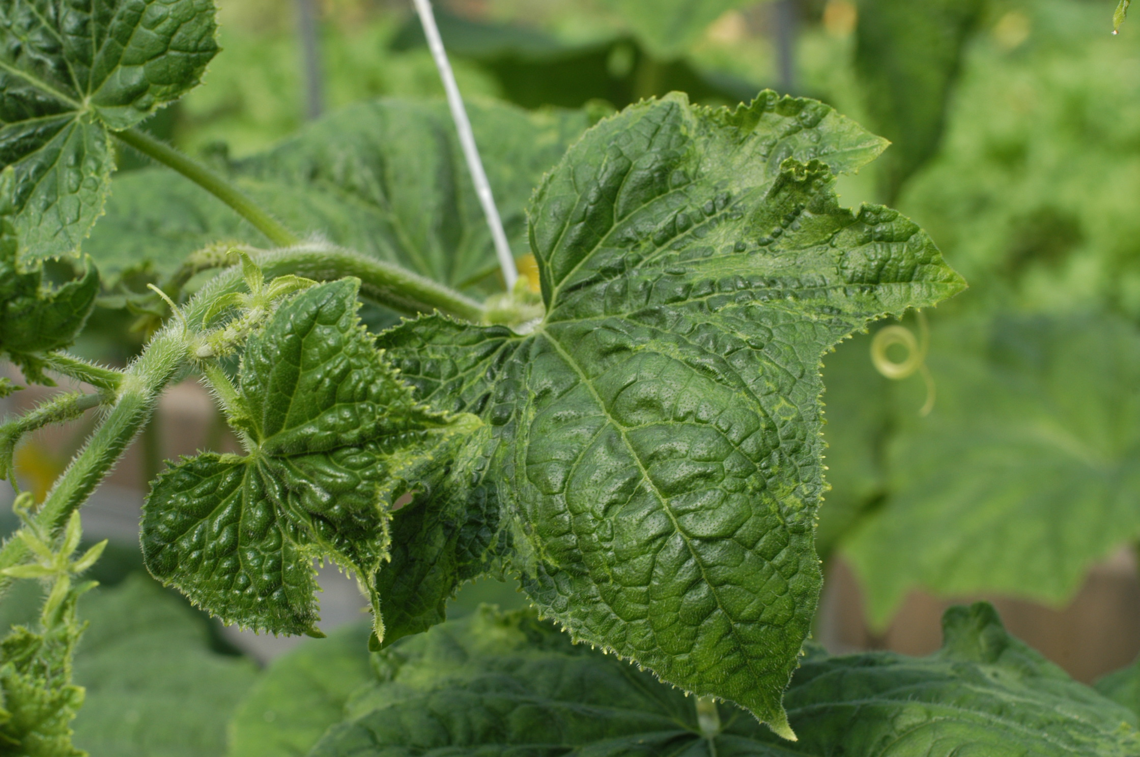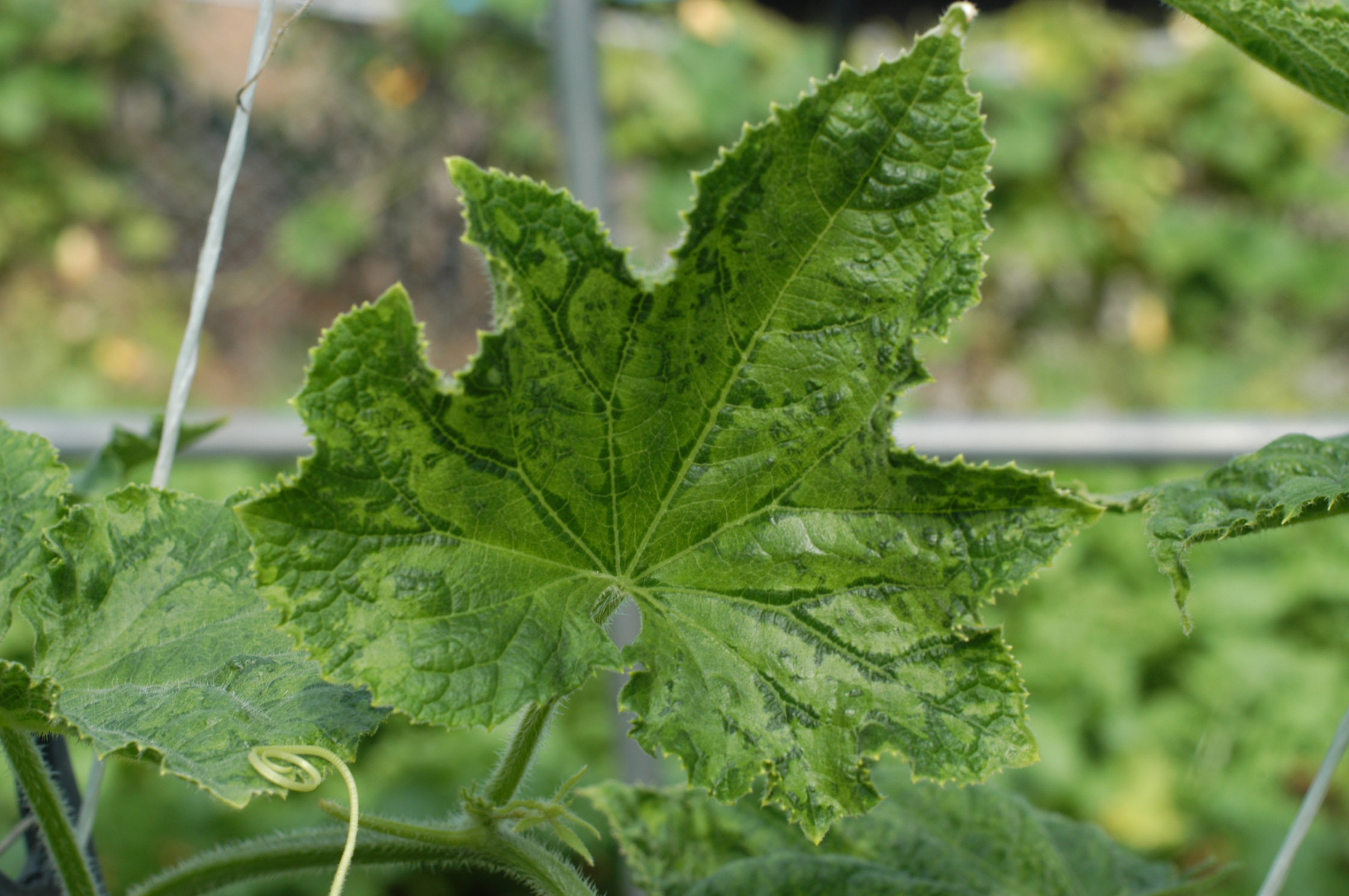 ◦ ZYMV 단독감염 시 잎에 모자이크와 기형이 나타나고 황화 병징과 괴저 반점을 수반하는 엽맥퇴록 병증도 나타나며, 과일에서는 침 기저부가 융기하고 과일 끝 부분이 뭉툭해 지는 기형 병징이 다양하게 나타남