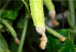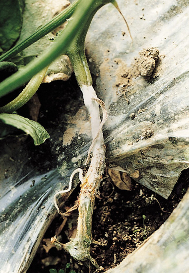 ◦ 줄기에서는 처음에 지제부가 약간 무름 증세을 보이며, 변색되어 썩고 진전되면 흰 균사가 자라며, 후에 감염부위에는 부정형의 검은 균핵이 형성됨