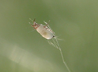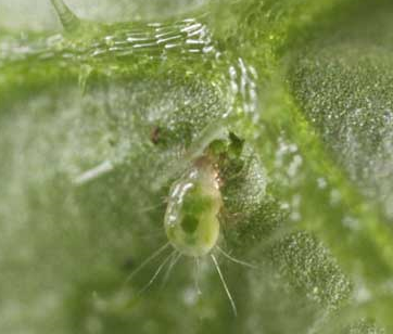 ◦ 유백색의 계란형 응애로 체장은 평균 0.4~0.5mm이고 앞몸마디등판 가장자리에 각각 색을 띠는 안점이 있음