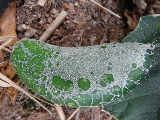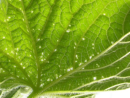 ◦ 생육 중에 잎이 피해를 받으면 처음에는 오이 잎에 흰색 반점이 나타나고 시간이 지나면서 반점에 구멍이 생기고 찢어지는 증상이 나타남