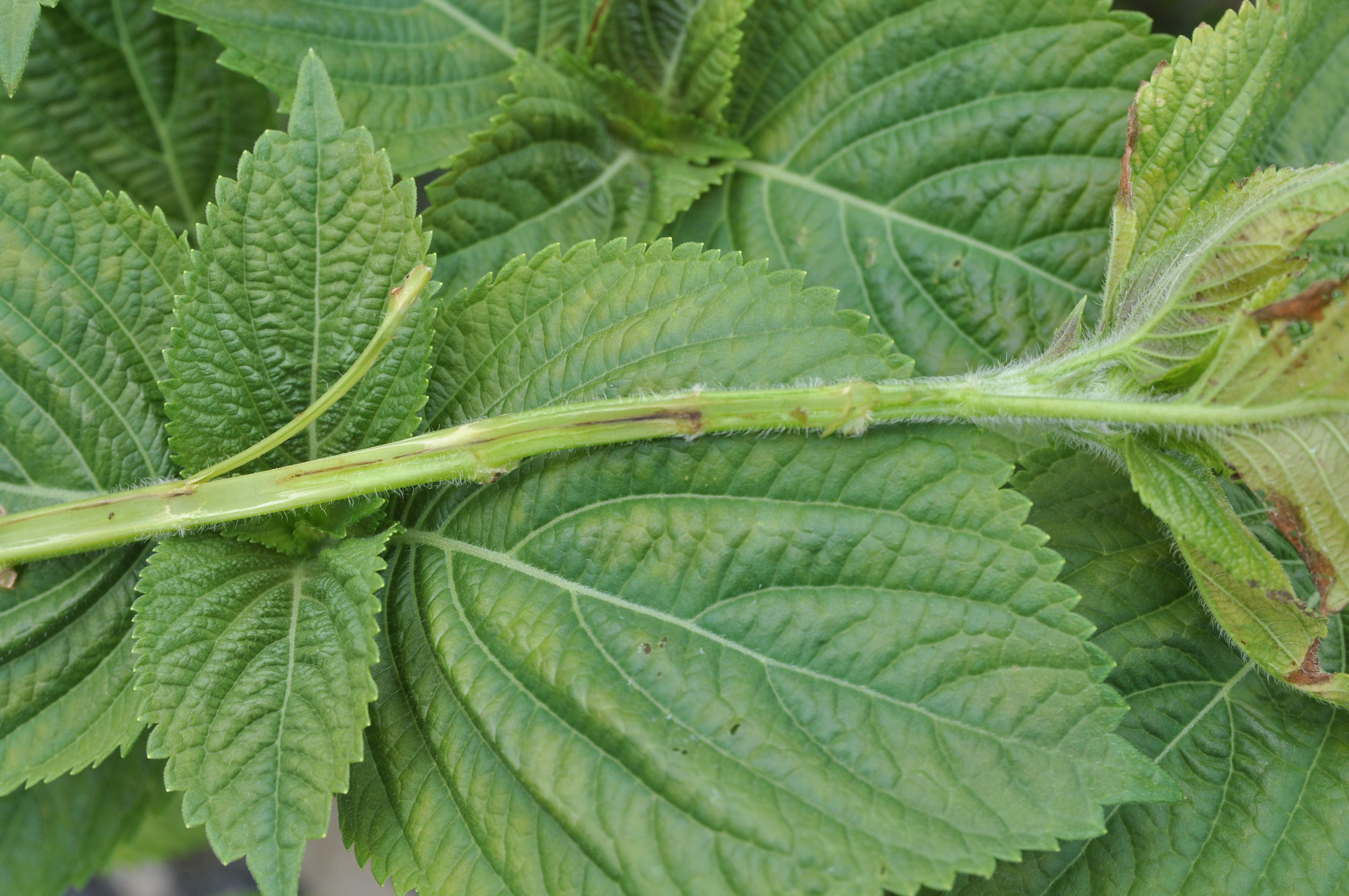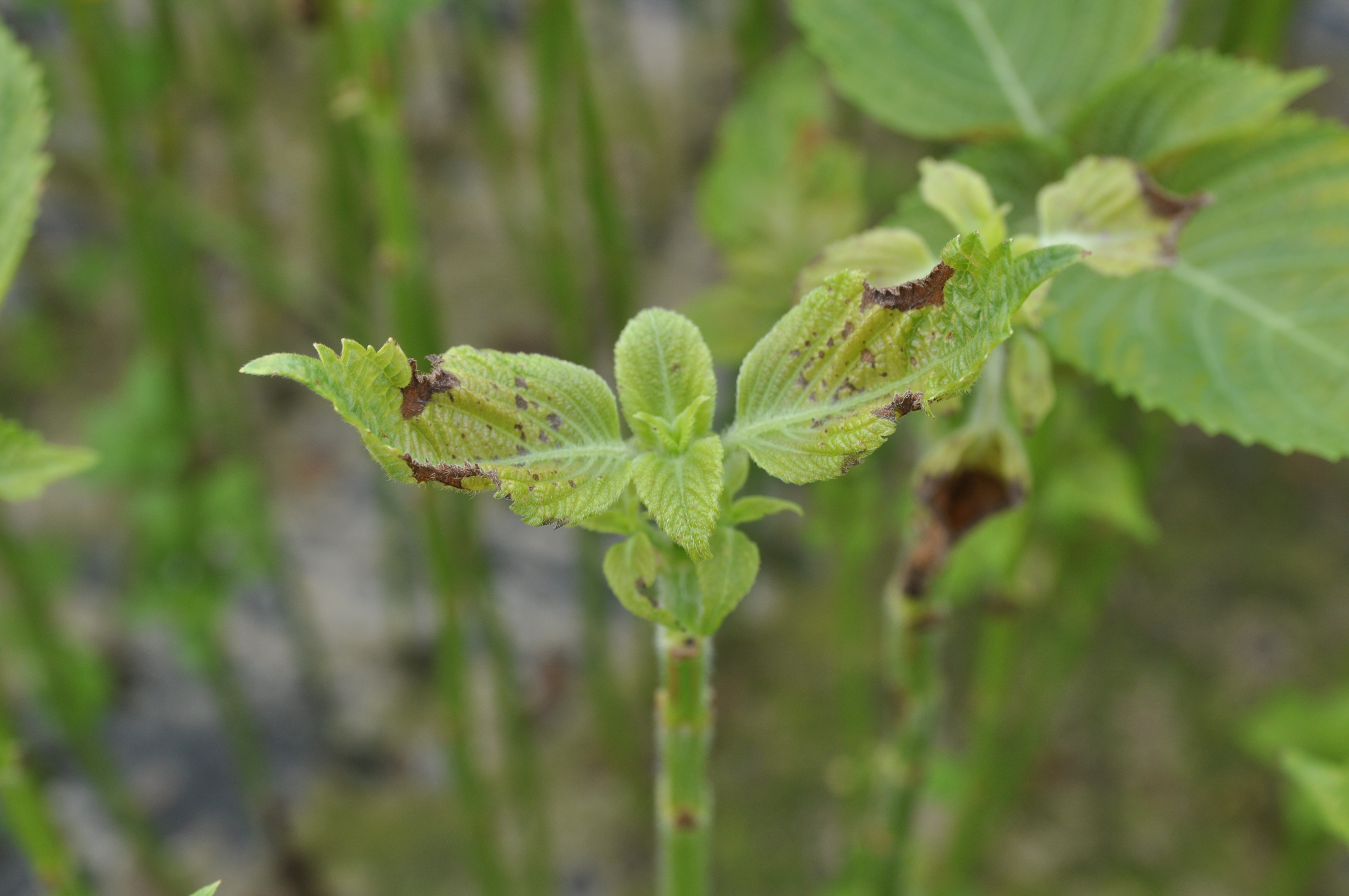 ◦ 채엽이나 상처 등에 의해 병원균이 줄기에 감염되었을 경우 감염된 부위의 내부 조직이 갈색으로 변하면서 진전되고 시간이 경과함에 따라 상부의 잎이 황화되고 부분적으로 괴사되며, 심하면 고사되고 새로운 잎이 나오지 않아 생육이 불량해짐
