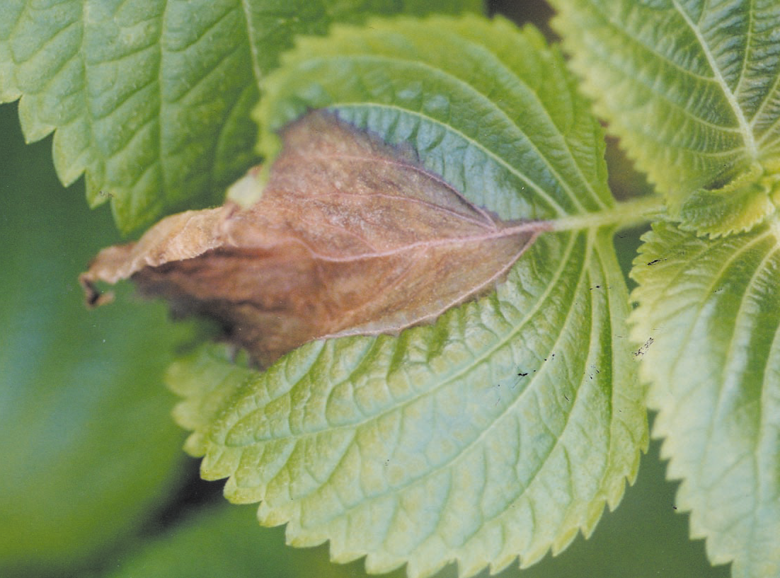 ◦ 초기에 잎에서는 갈색의 병무늬가 형성되고 진전되면 병무늬의 크기가 잎 전체로 확대되며, 특히 신초 부위에 이병이 되면 신초가 검은색으로 변하면서 분생포자가 형성됨