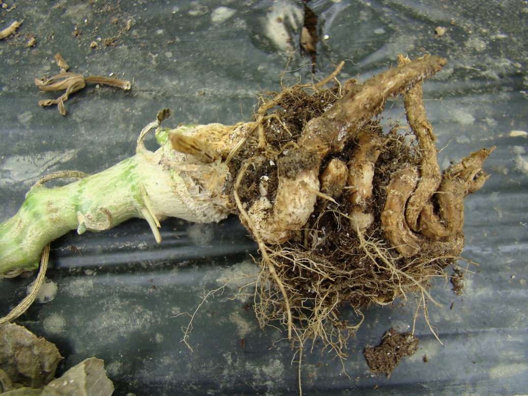 ◦ 서서히 시들음 증상을 보이고 지제부 부근과 측근이 갈색으로 변하면서 약간 잘록해지고 줄기썩음 증상이 나타나며, 심화되면 주전체가 시들면서 마침내 말라 죽음
