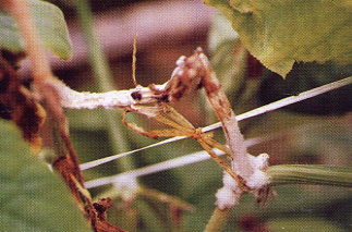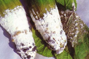◦ 잎과 잎자루에서는 주로 상처 부위에서부터 감염되어 흰 균사가 자라면서 썩고 후에 균핵이 형성됨