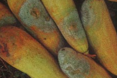 ◦ 병든 포기의 땅가줄기와 굵은 뿌리는 수침상으로 썩고 쉽게 뽑히며, 과실에는 부정형의 큰 수침상 병반으로 나타는데, 병든 부위에 하얀 균사체와 유주자낭이 형성되기도 함