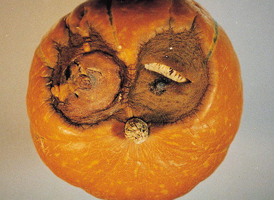 ◦ 심하게 진전되면 병반이 겹둥근무늬로 확대되고 병반의 중앙 부위는 물러 썩으며, 후에 과실의 내부까지 병원균의 균사가 자라면서 심하게 썩음
