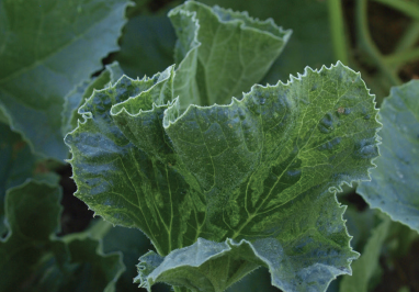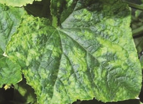 ◦ 초기에 감염된 잎에서는 초기에는 약한 잎맥투명으로 나타나서 모자이크로 진전되며, 심해지면 잎액 주위에 주름이 생기고 잎이 요철 상태로 오목 부분은 녹색으로 남아 있고 그 외 부분은 황색으로 변함