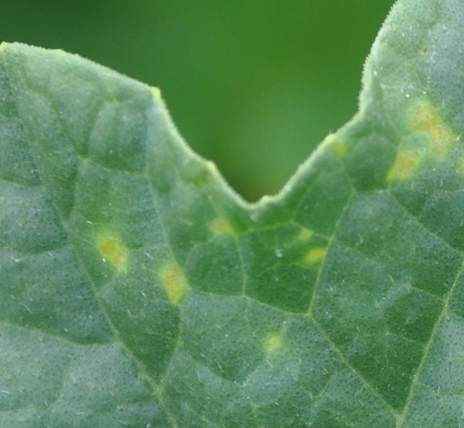 ◦ 초기에는 잎의 앞면에 퇴록된 부정형 반점으로 나타나고 엷은 황색을 띠는데, 잎 뒷면의 병반은 불분명함