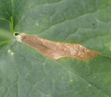 ◦ 병든 잎은 잘 찢어지고 황갈색을 띠며, 환경이 적당하면 잎 뒷면에 이슬처럼 보이는 곰팡이가 다량 형성되고 흰색 혹은 회색으로 보임