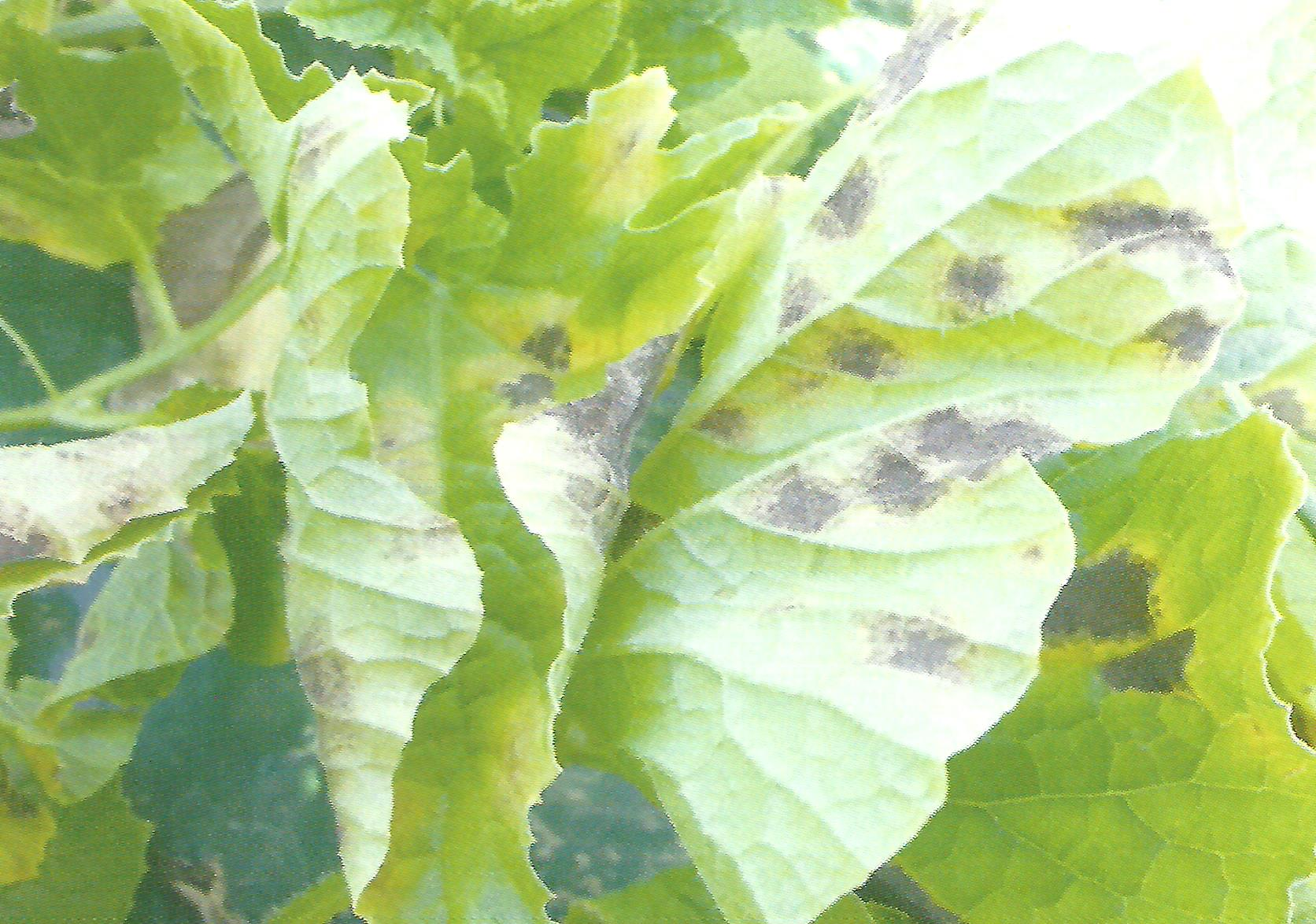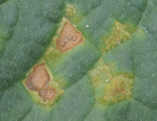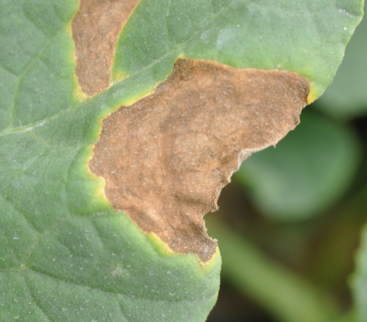 ◦ 아랫잎에서 먼저 발생되고 위로 진전되며, 병반은 주로 엽맥을 경계로 하는데 이들이 합쳐지면 잎이 말라죽음