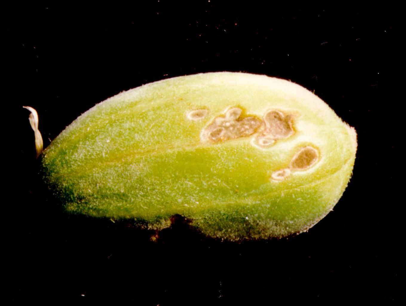 ◦ 과실에는 암녹색 내지 암갈색의 반점으로 나타나고 진전되면 직경 0.5~1cm 크기의 병반으로 확대됨