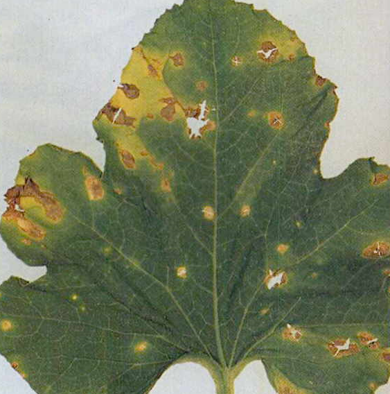 ◦ 잎이나 과실 모두 오래된 병반에는 흑색가루(분생포자)가 밀생하여 병반이 흑색 또는 흑갈색으로 보이고 병든 잎은 후에 구멍이 뚫리고 병든 과실에는 더뎅이증상이 나타남