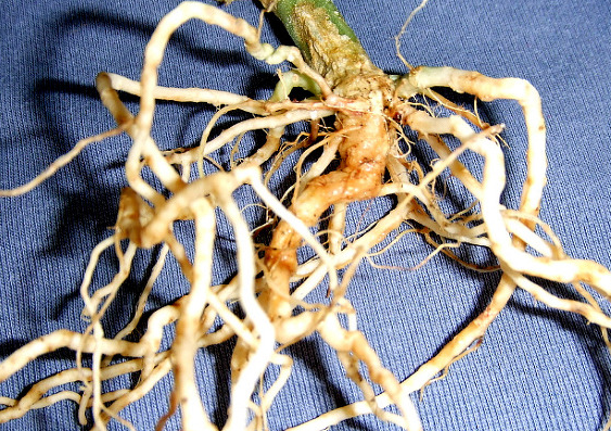 ◦ 일반적으로 잔뿌리가 먼저 침해를 받고 진전되면 주근과 줄기 아래로 병이 진전되며, 생육 중기와 후기에는 병발생이 그리 많지 않지만 토양이 다습하고 배수가 불량하면 심하게 발생함