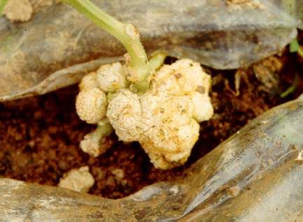◦ 주로 접목이나 적심부위에 둥근 혹이 생겨 20cm 크기까지 자라며, 병이 진전됨에 따라 식물은 활력이 저하되나 급속히 말라 죽지는 않음