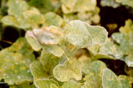 ◦ 피해 부위에는 백색의 작은 반점이 남으며, 초기에는 연녹색으로 변색되나 점차 피해가 심해지면 황색~갈색으로 변하여 낙엽이 됨