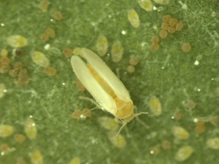 ◦ 성충은 0.8mm 정도로 체색은 짙은 황색이며, 잎에 앉아 있을 때는 날개를 바닥쪽으로 좁게 펴고 있어서 위에서 볼 때 노란 몸색이 두드러져 보임